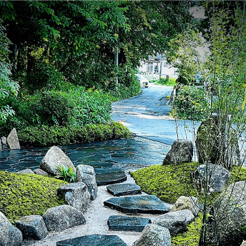 背景の雑木林から繋がるような植栽と苔の築山の間を縫うように、玄関までのアプローチが作ってあります。飛石には諏訪鉄平石の厚みのあるものを使っています。